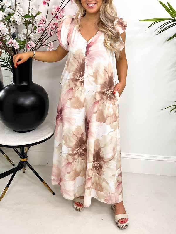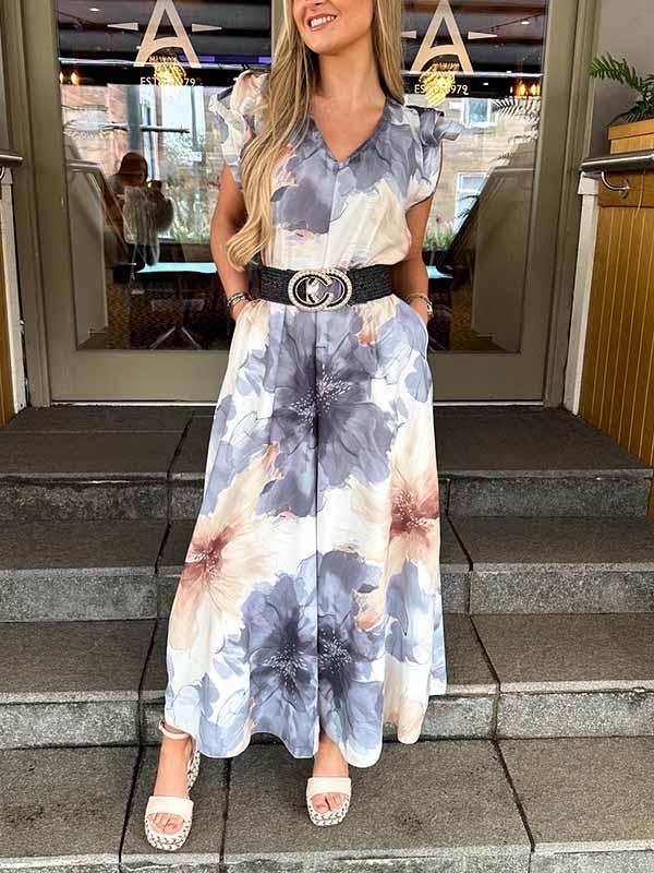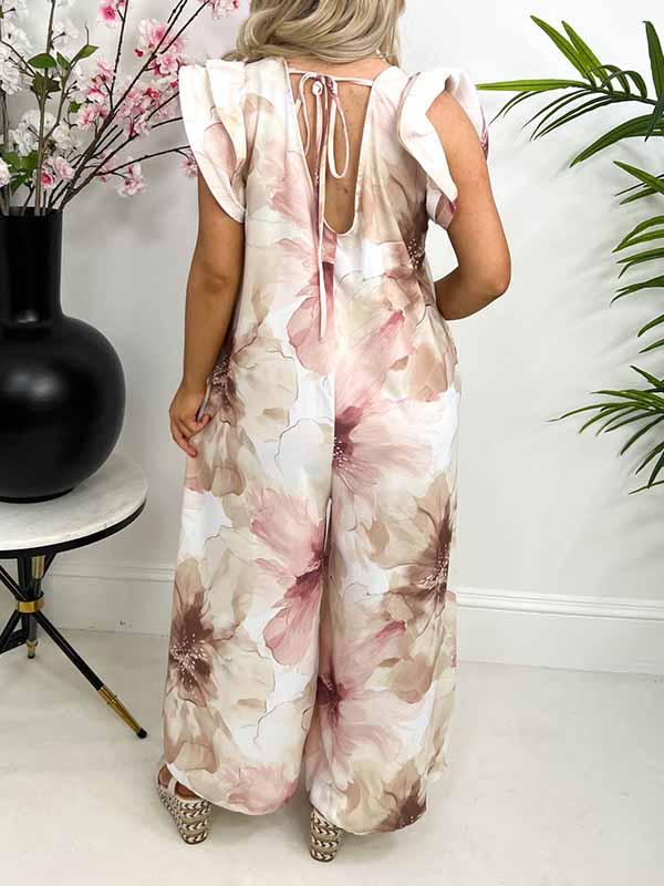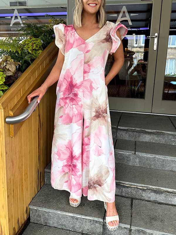 Women's V-neck Cap Sleeve Printed Jumpsuit