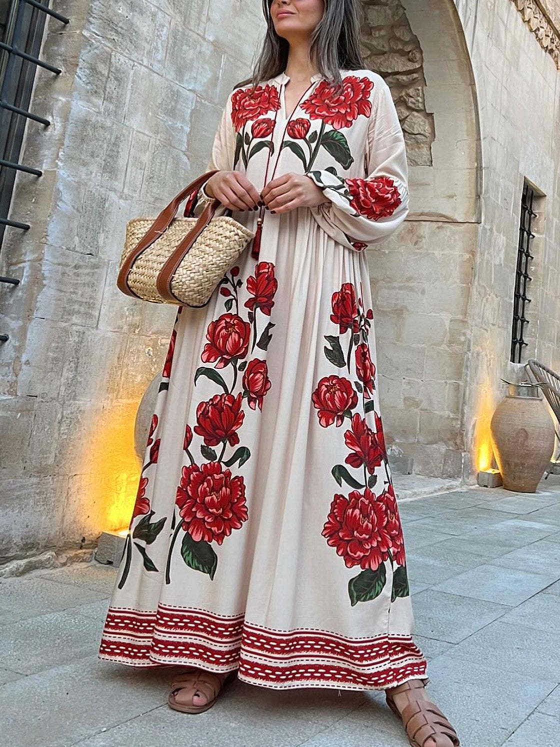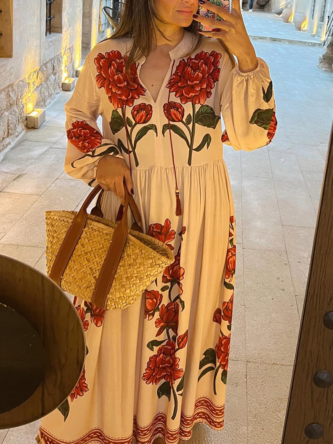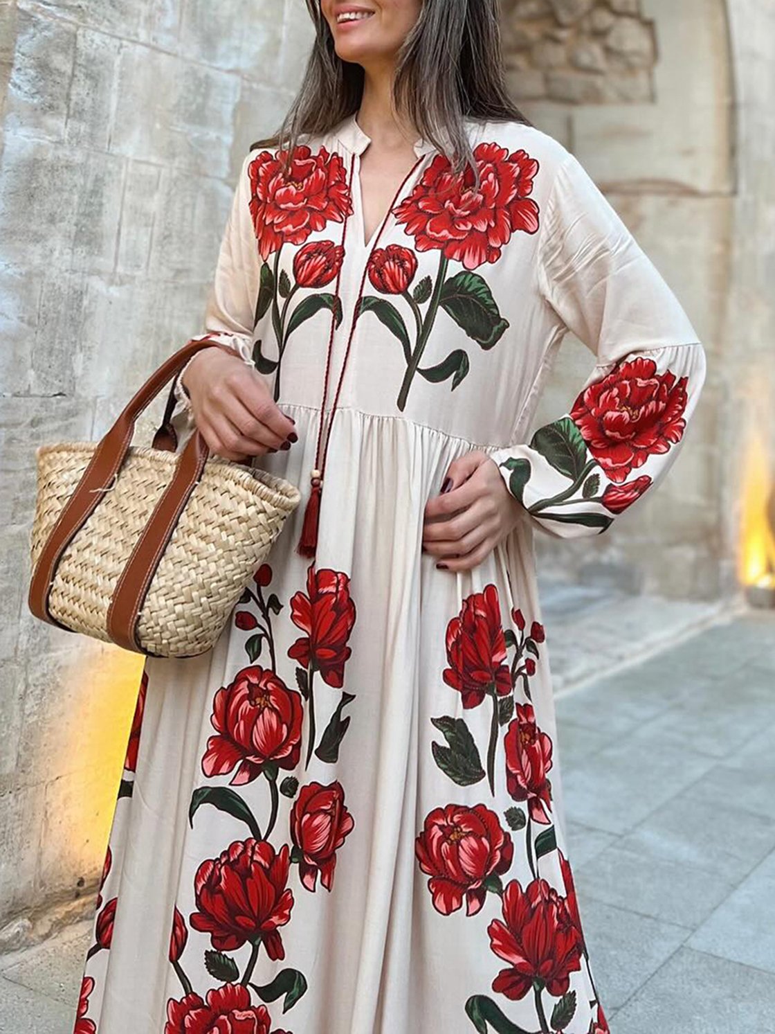• Notched V Neck Long Sleeve Floral Print Vacation Maxi Dresses