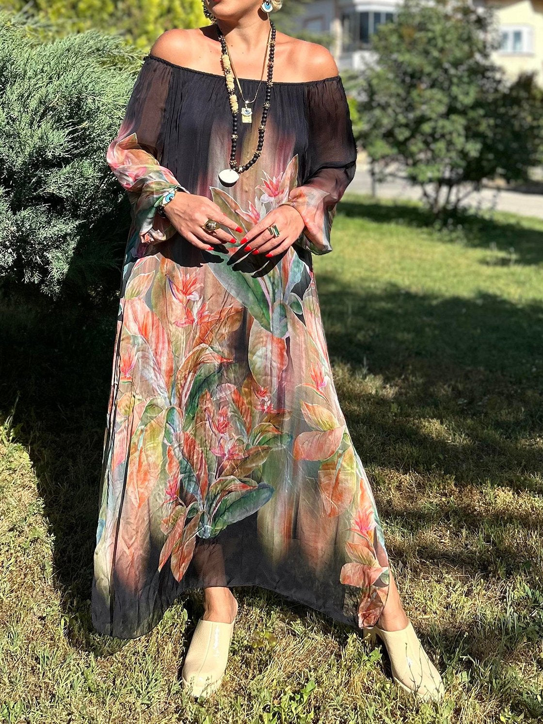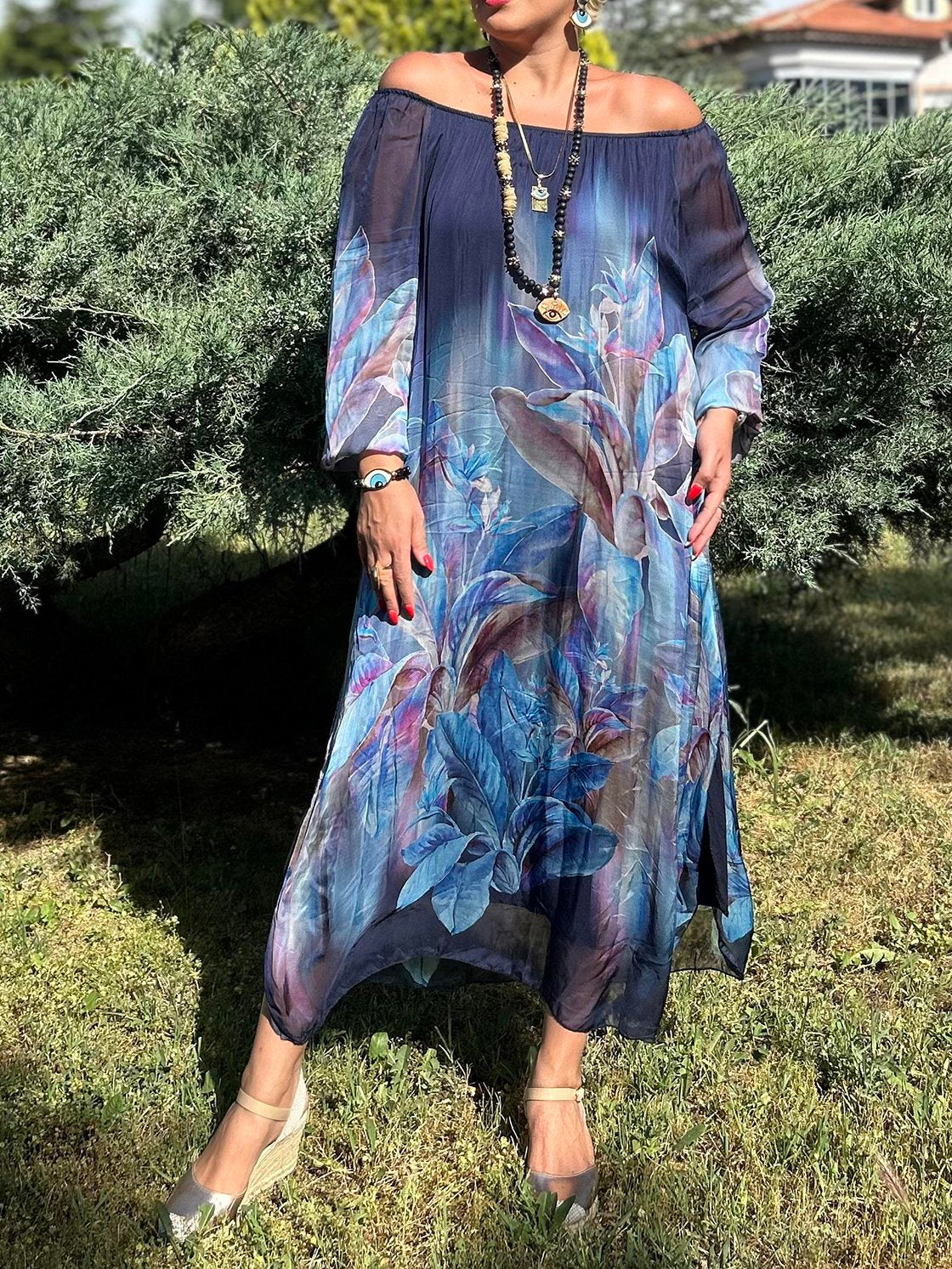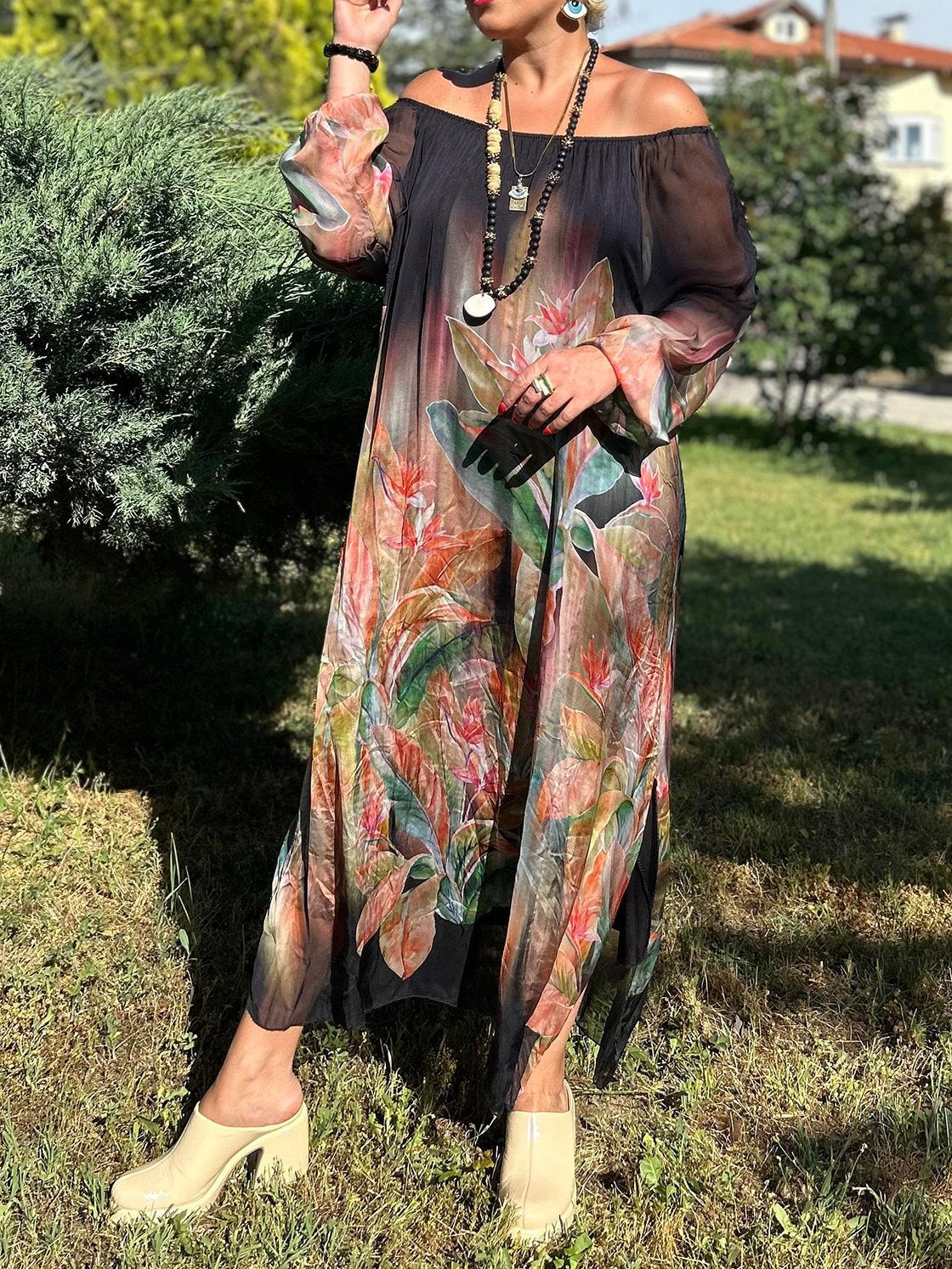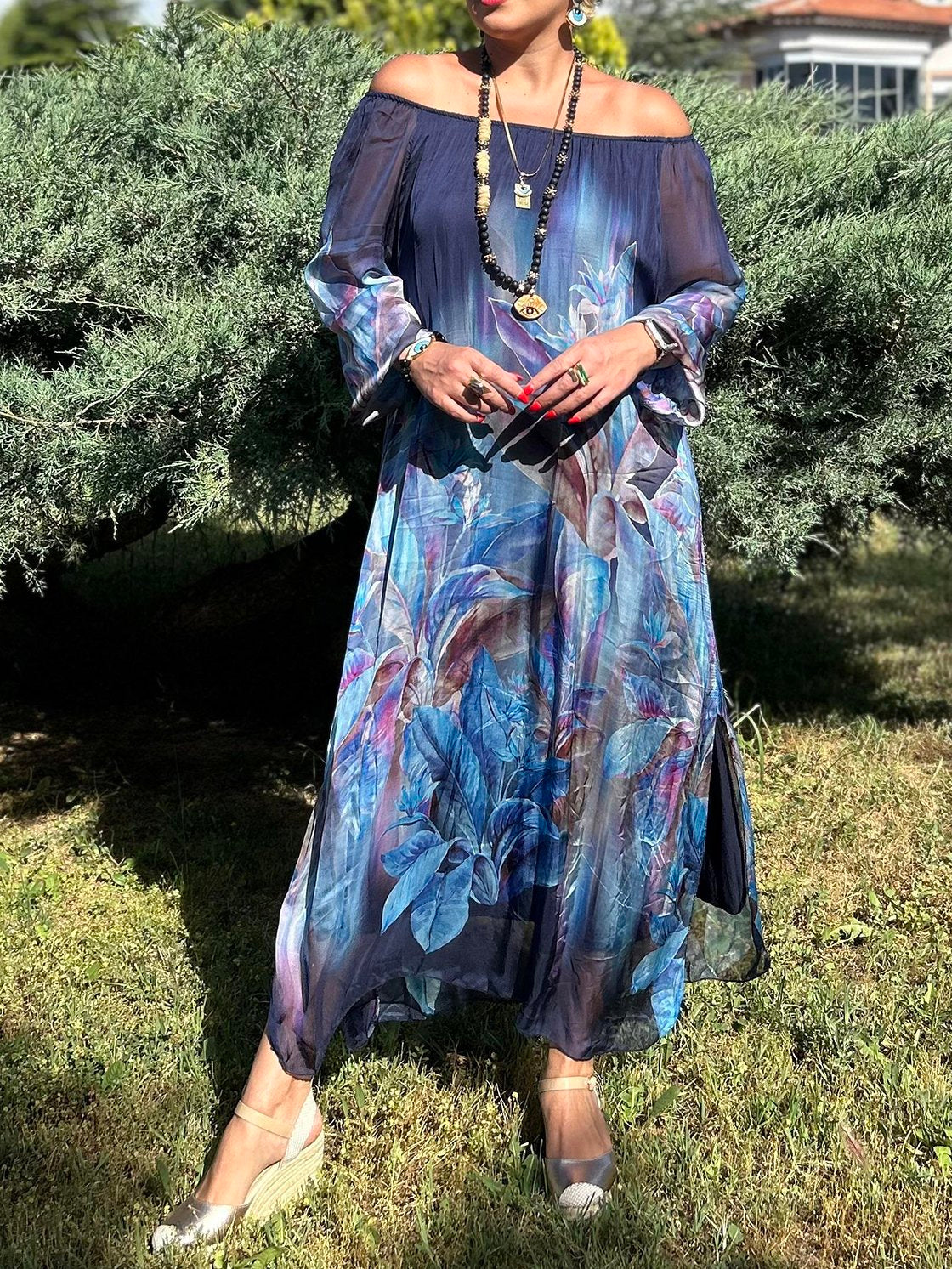 • Women's Casual Floral Print Off Shoulder Chiffon Dress