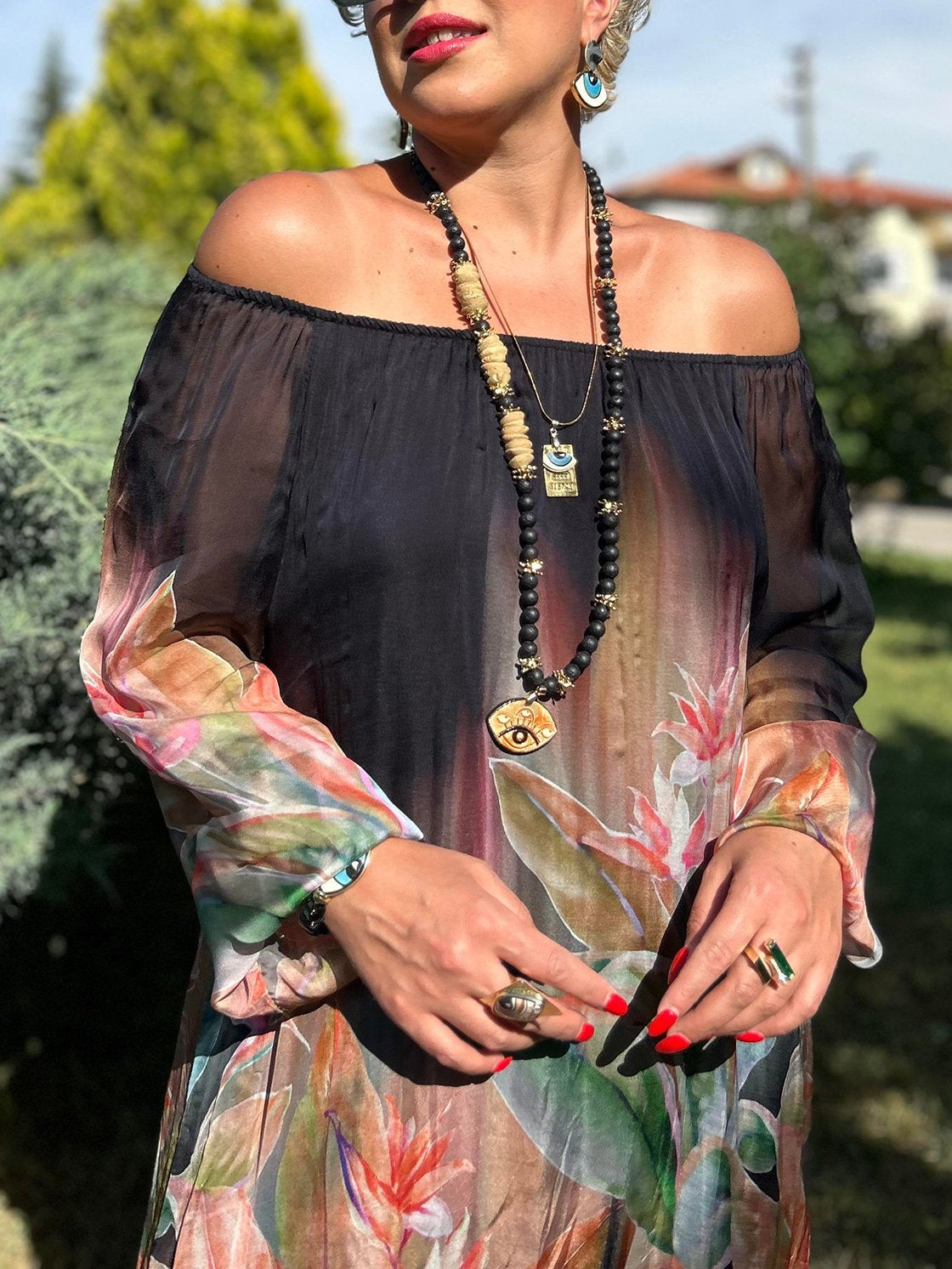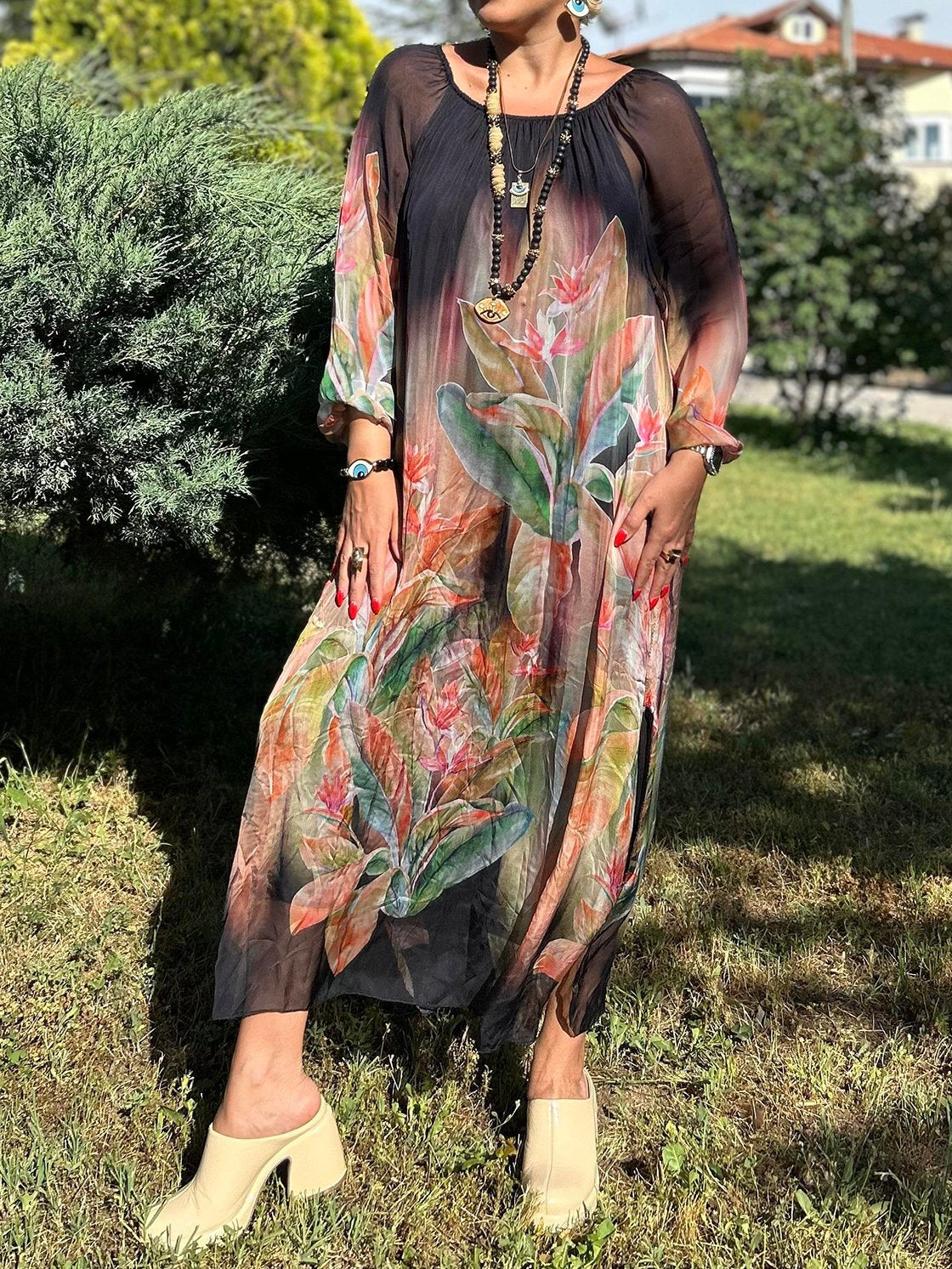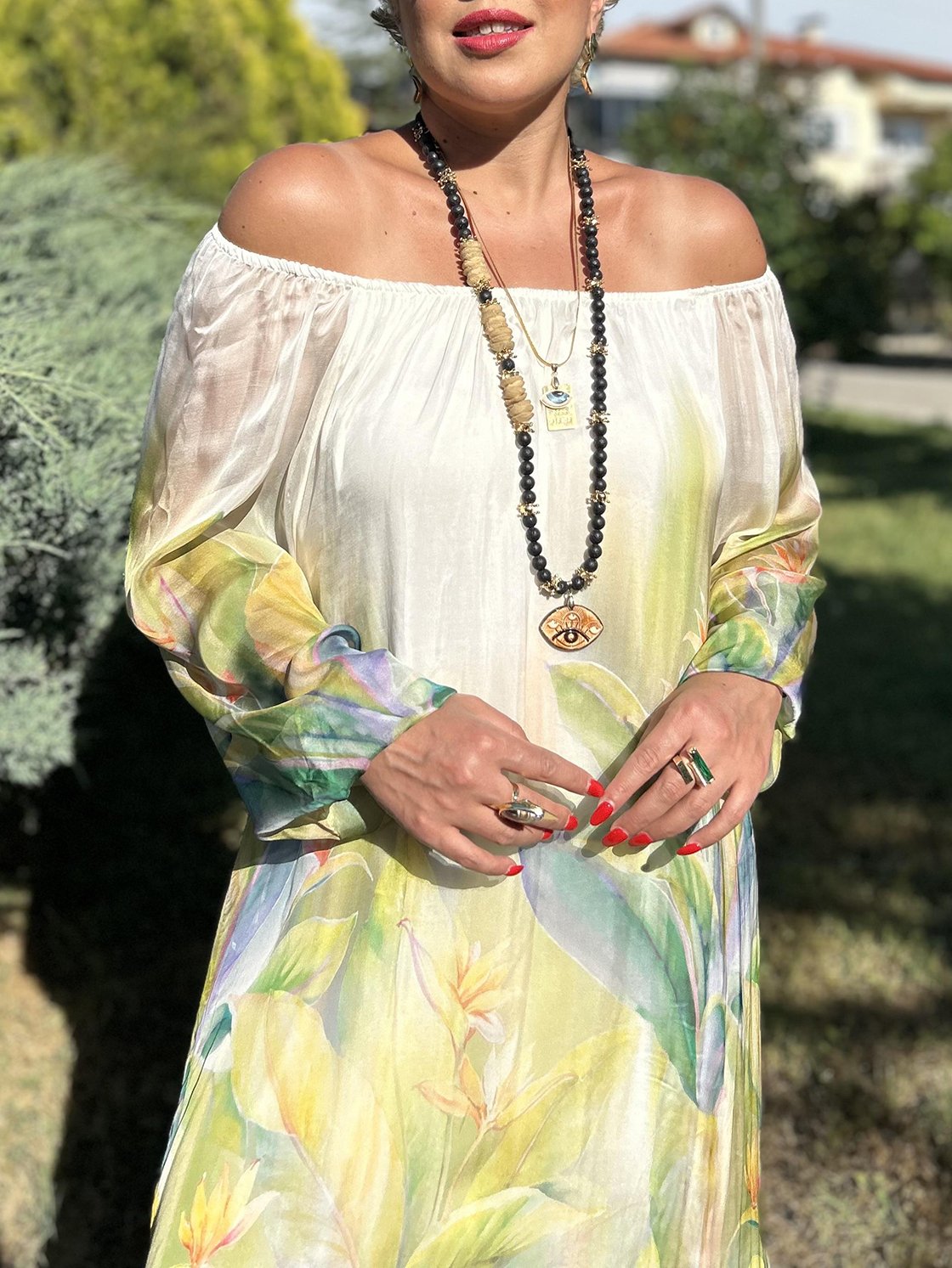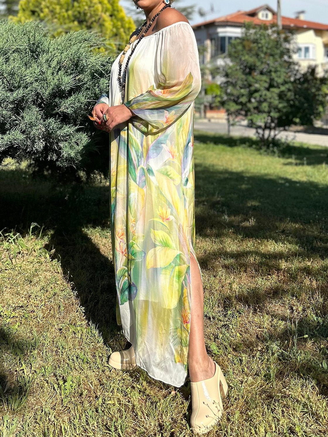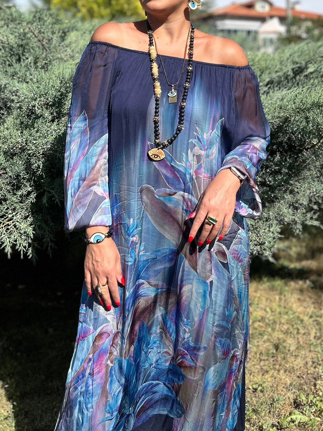 • Women's Casual Floral Print Off Shoulder Chiffon Dress