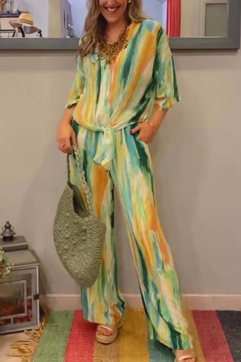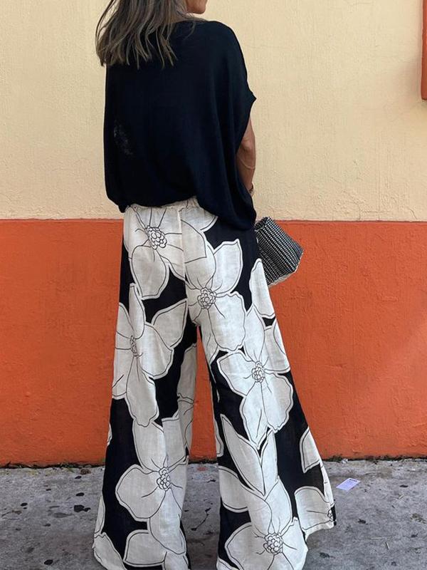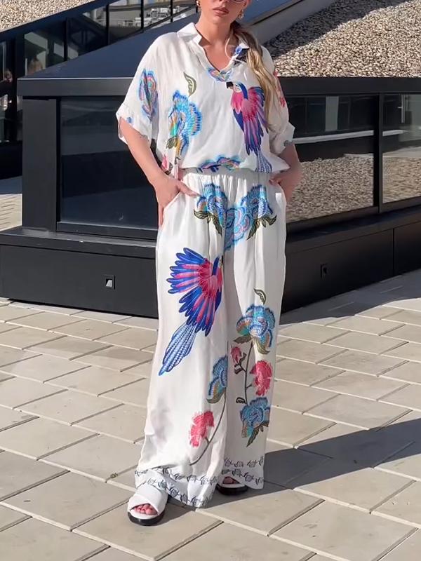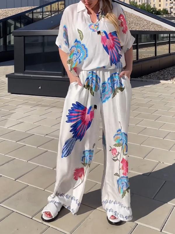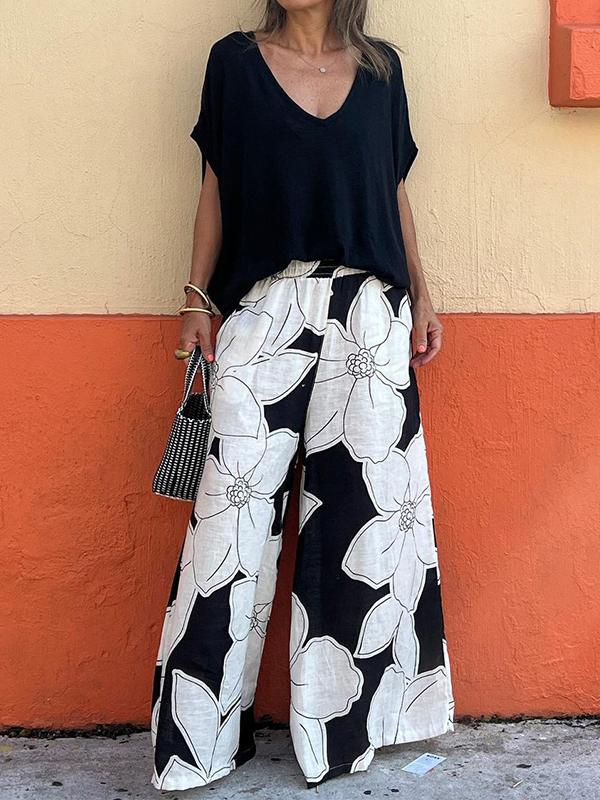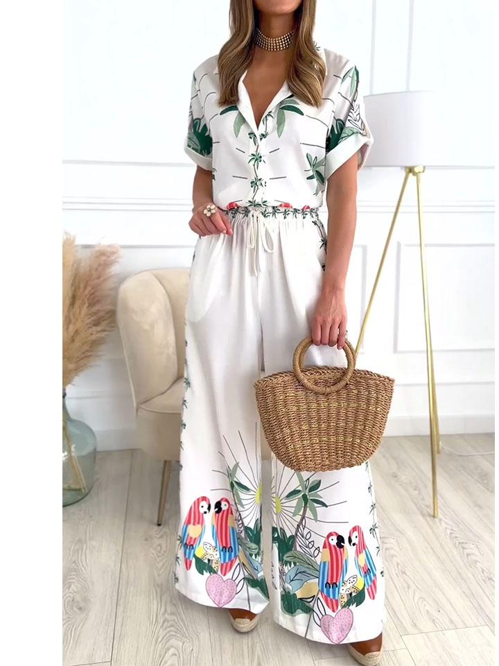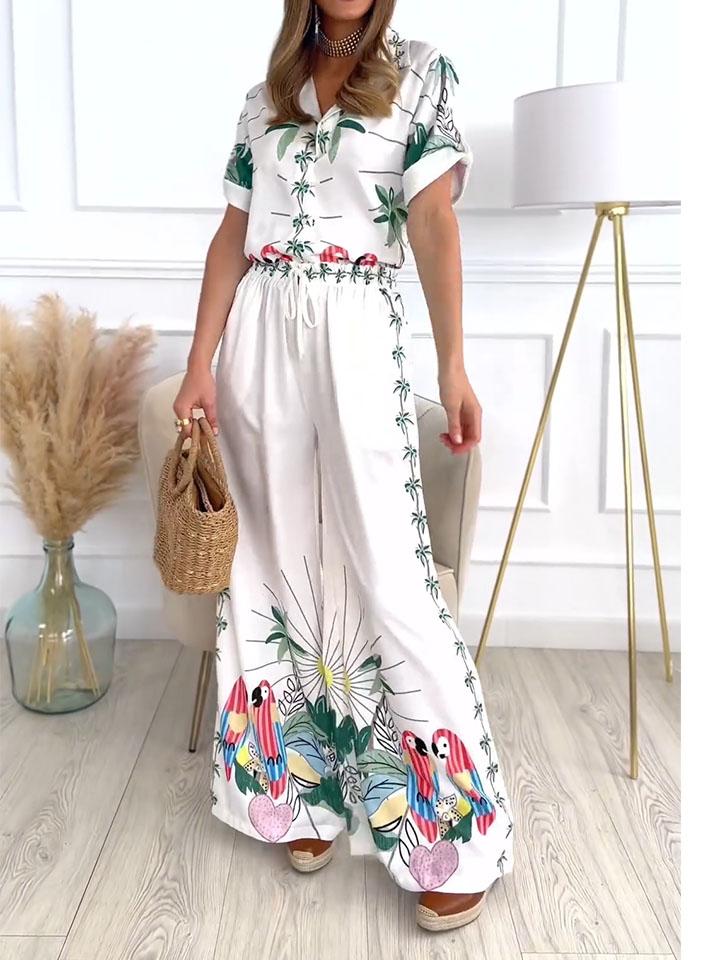 Women's Two-piece U-neck Short Sleeve and Printed Trousers