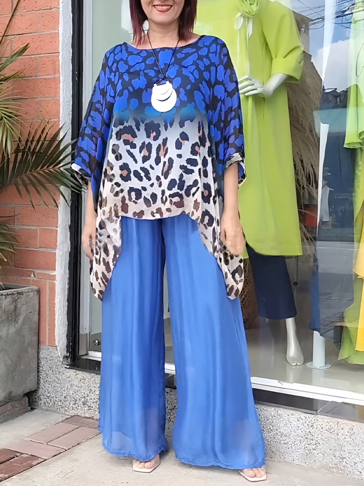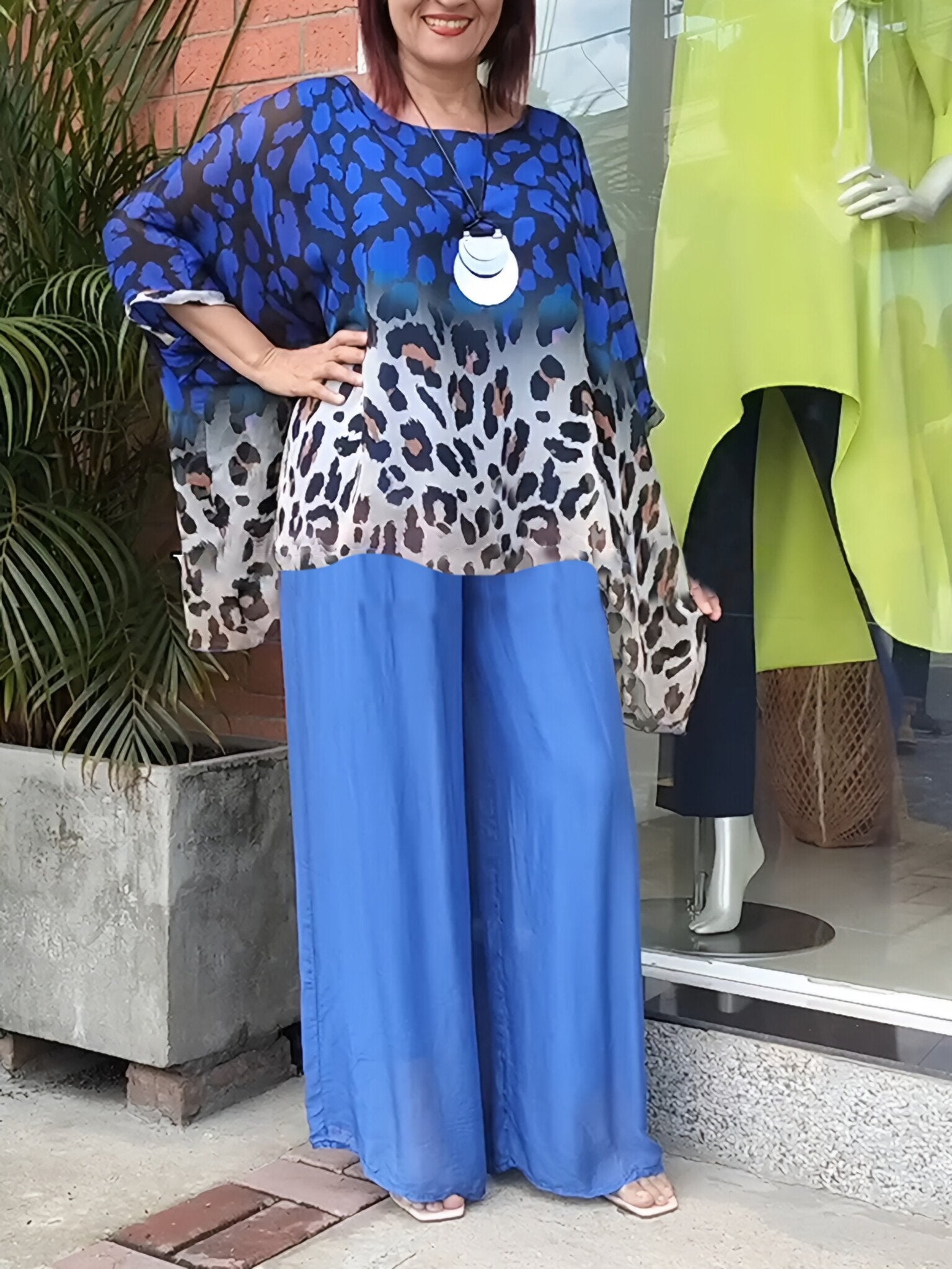 Women's Round Neck Mid-sleeve Leopard Print Chiffon Casual Suit