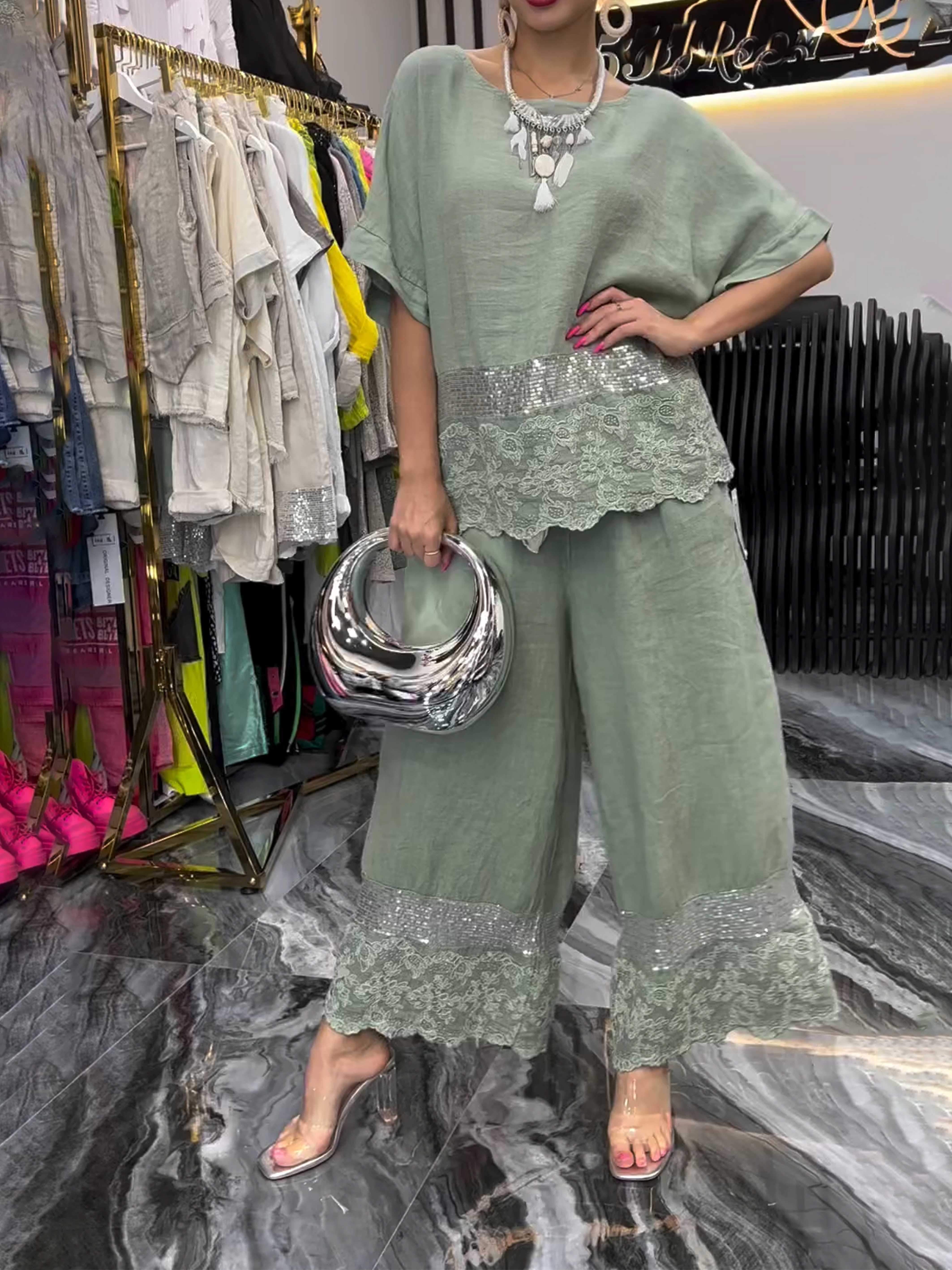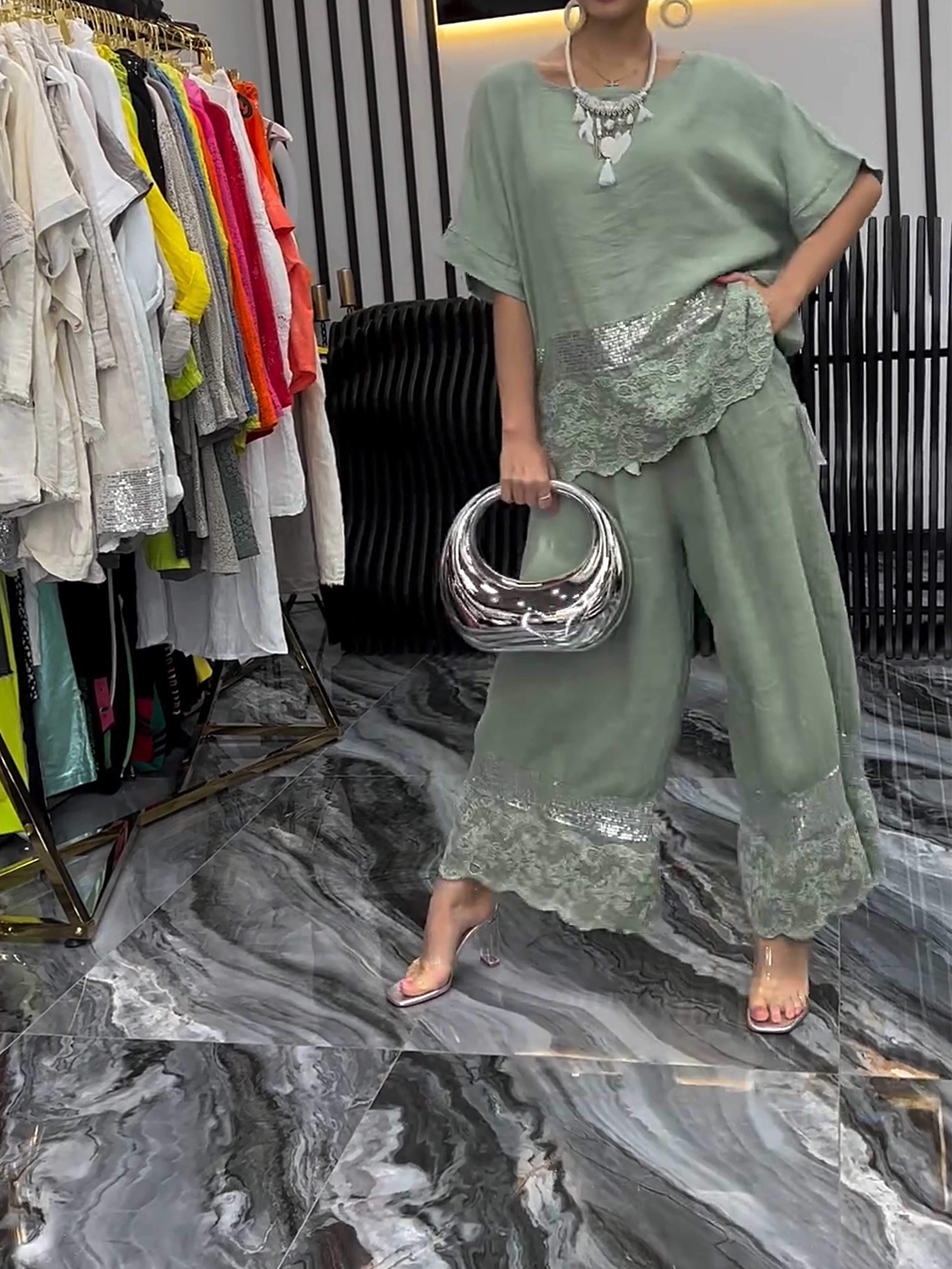 Women's Cotton and Linen Spliced sequined Lace Suit