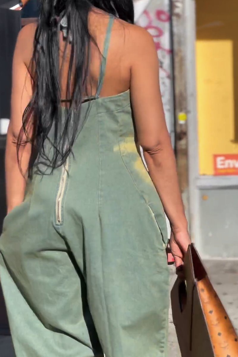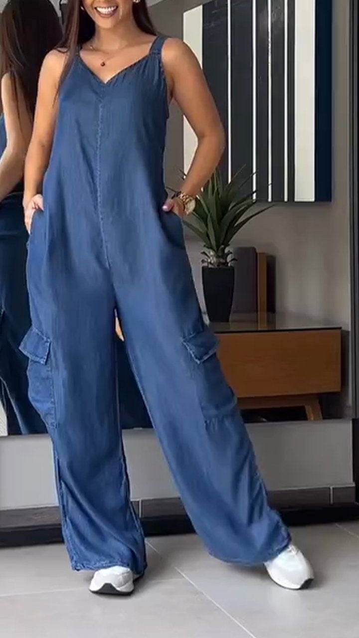 Thin Denim Cargo Pocket V-neck Jumpsuit