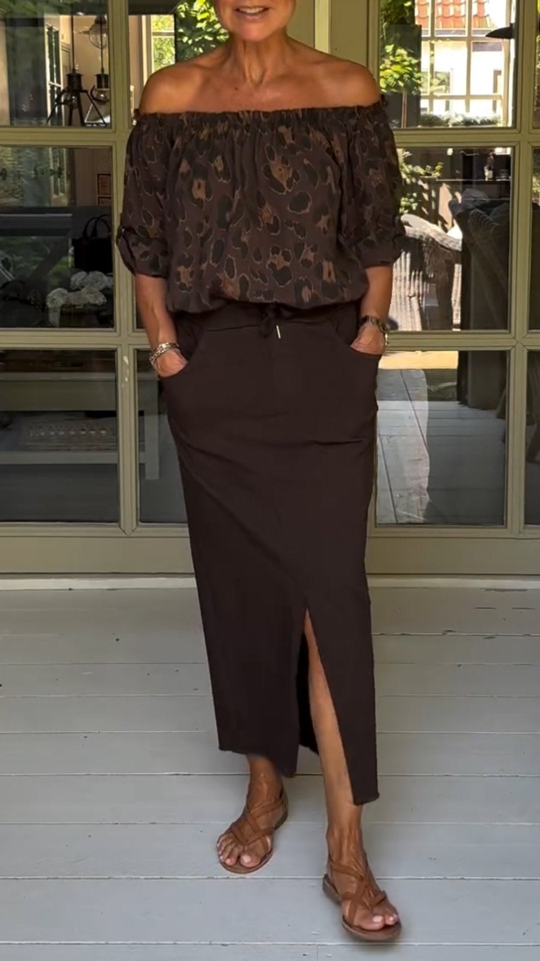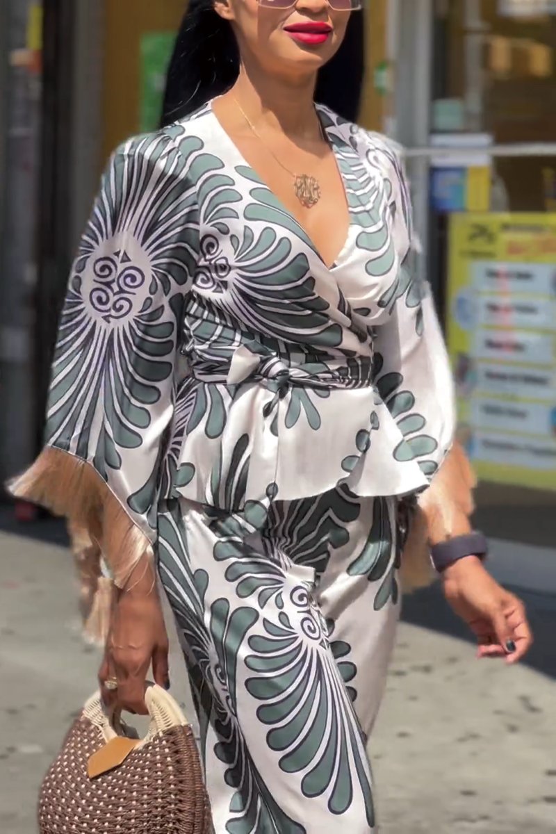 Women's Printed Line Shoulder Top and Split Skirt Suit