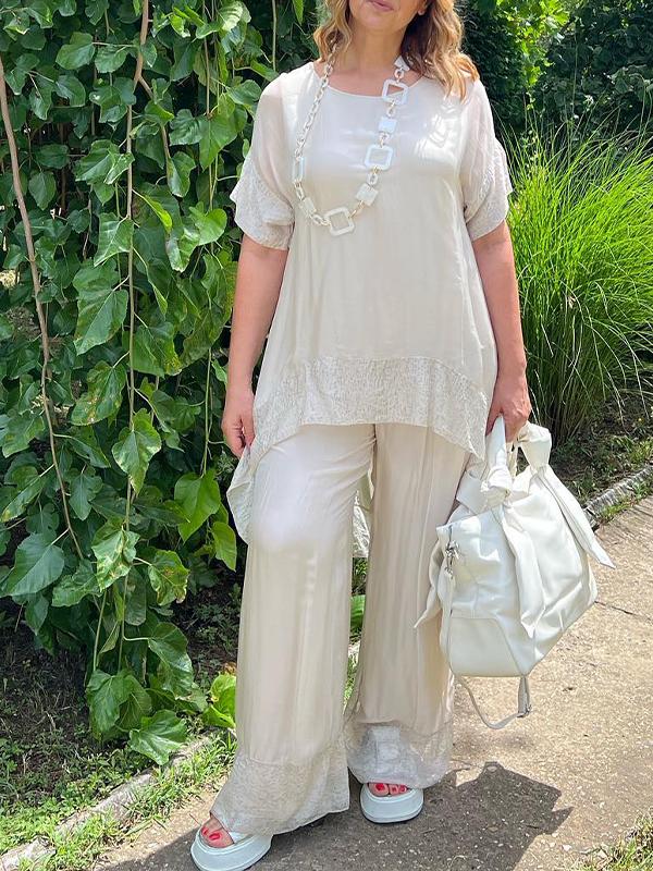 Women's Casual Lace Spliced Cotton and Linen Slit Pants Two-piece Set