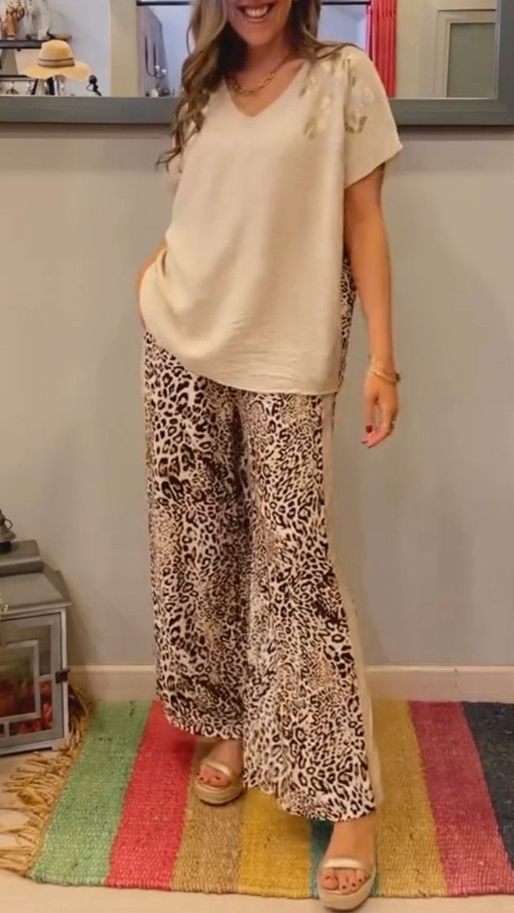 Women's V-neck Short-sleeved Leopard Print Casual Suit